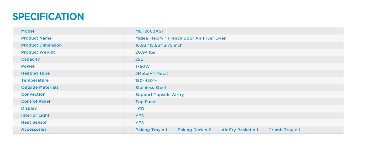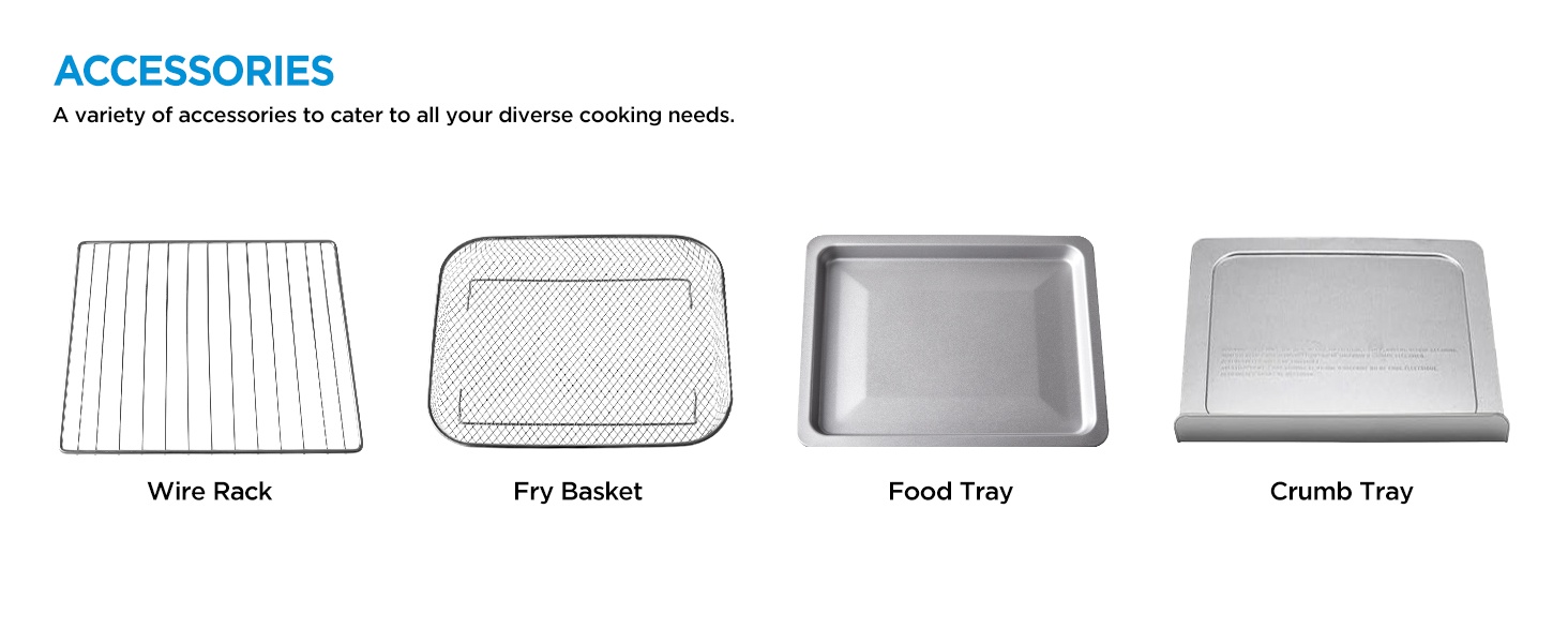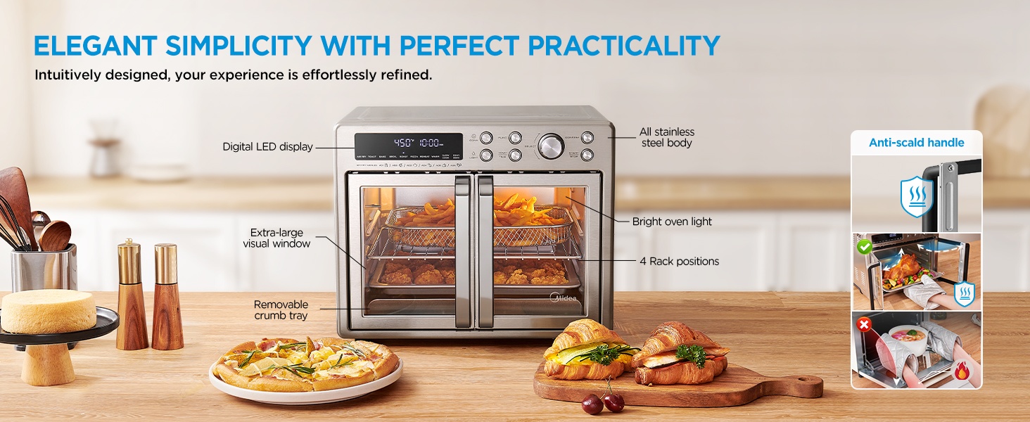 Design élégant : Des portes françaises doubles anti-brulure stylées et un grand écran numérique LED ajoutent de l’esthétique à votre espace de cuisson. L’appareil inclut un bac à miettes, un panier de friteuse à air, une grille de cuisson et une plaque de cuisson, répondant à tous vos besoins de cuisson et de pâtisserie.
