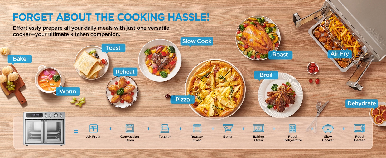 10 fonctions polyvalentes : Frite à air, Rôtit, Cuisson au four, Grille, Torréfie, Pizza, Réchauffe, Cuisson lente, Déshydrate, Chaud maintien. Préparez les repas de la famille d’une manière plus flexible.
