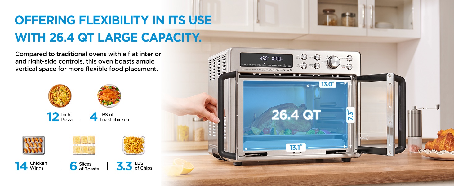 Grande capacité : Friteuse à air four grille-pain à portes françaises de 26,4 QT, qui accueille parfaitement une pizza de 30 cm (12 pouces), jusqu’à 6 tranches de pain torréfié ou 14 ailes de poulet juteuses. Un ajout idéal pour votre cuisine.