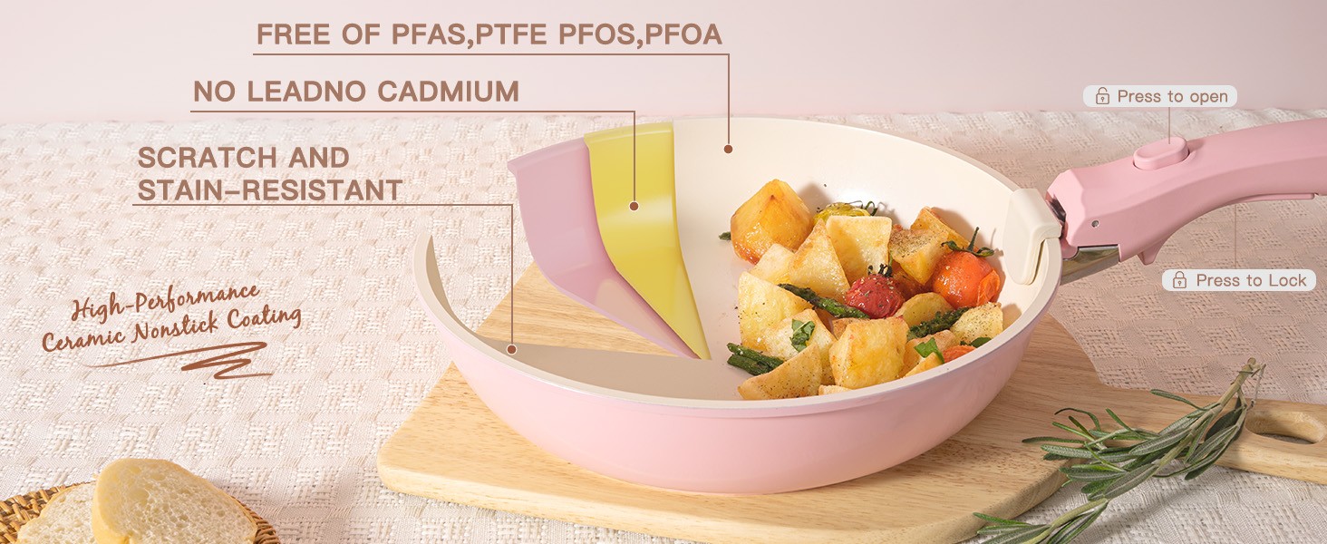 【Poignée amovible sécurisée】Ce set d’ustensiles est doté d’une poignée amovible innovante avec un mécanisme de verrouillage sécurisé. Il assure une prise en main stable et fiable pendant la cuisson, vous permettant de cuisiner en toute confiance à chaque fois.