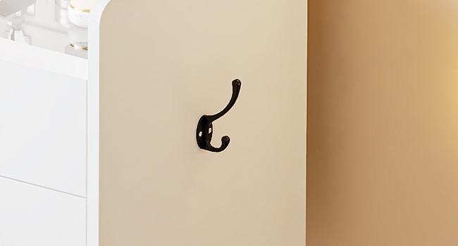 Crochet polyvalentLorsque le miroir est fermé, il sert de bureau pour accrocher mallettes et manteaux ; lorsque le miroir est ouvert, il sert de coiffeuse pour accrocher sèche-cheveux ou sacs ; et en tant que table de chevet, il permet d’accrocher des serviettes.