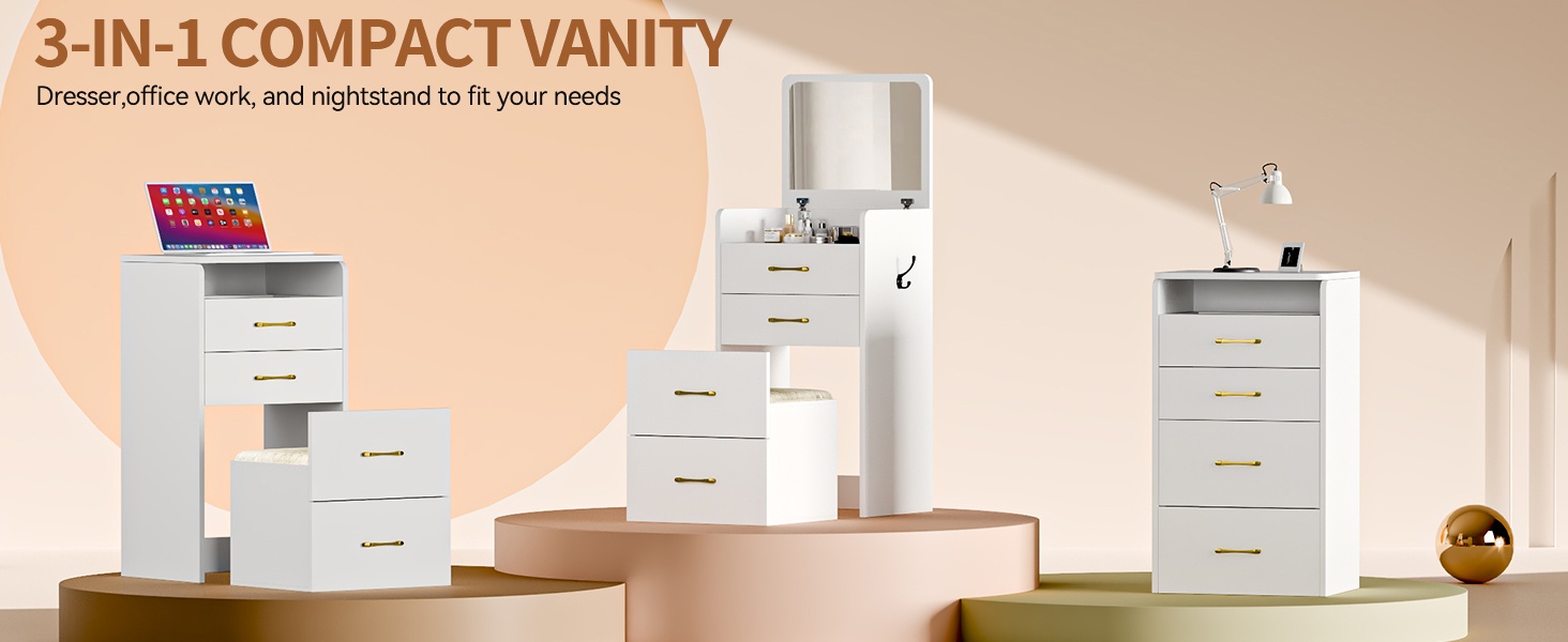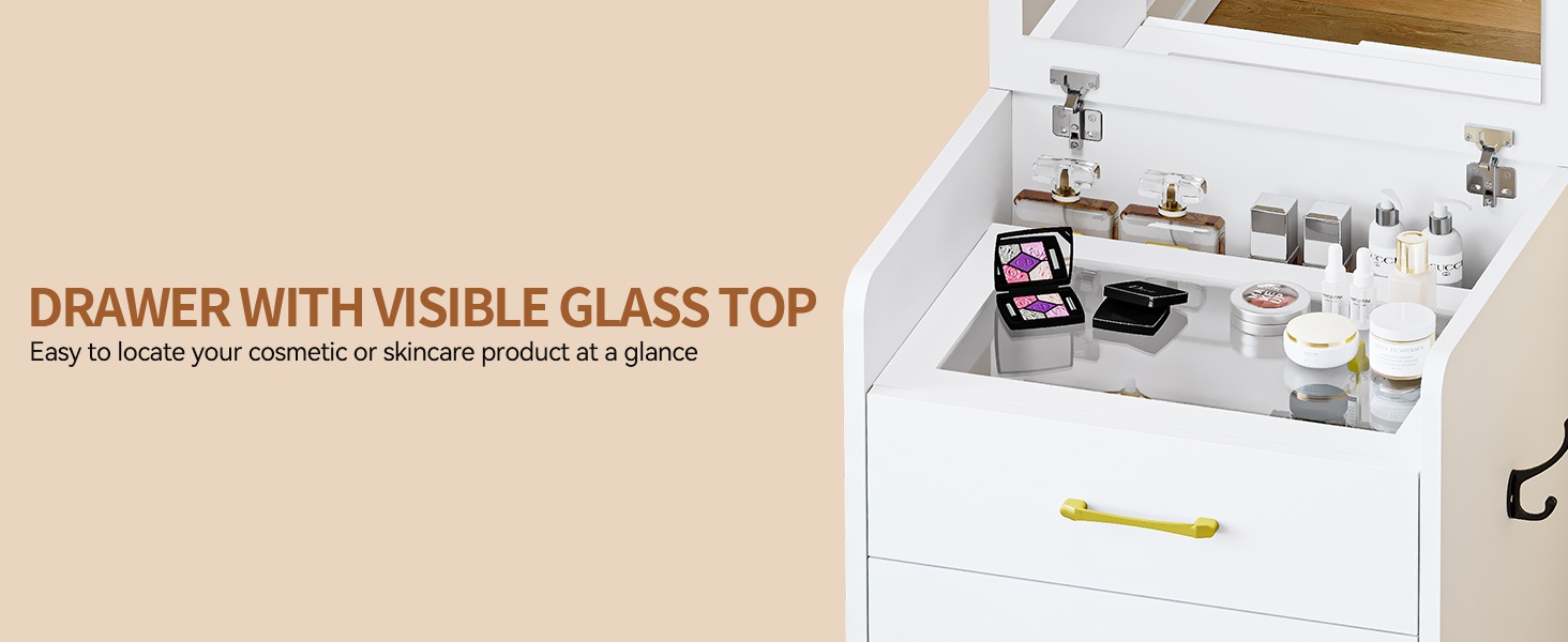 Avec plateau en verre transparentCoiffeuse compacte 3 en 1 avec miroir à rabattre et tabouretMiroir à rabattrePlateau en verre transparent3 tiroirs + Espace de rangement de 20,3 cm de profondeur + CrochetTabouret rembourré