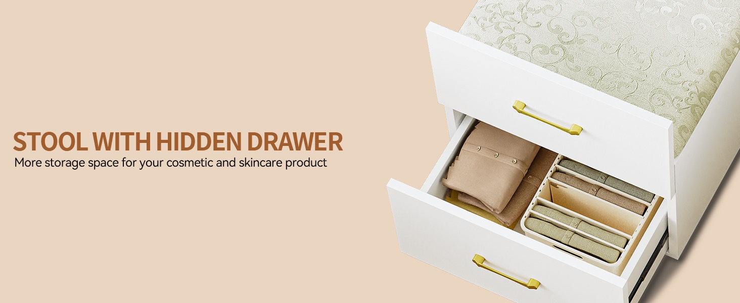 Équipée d’un organisateur de bijoux à rabattre, d’un espace de rangement caché pour vos grands flacons de soins de la peau, d’un tiroir et d’un tabouret rembourré avec un grand tiroir organisateur : ce dernier peut contenir une grande quantité de maquillage, de bijoux et de produits de soins de la peau.