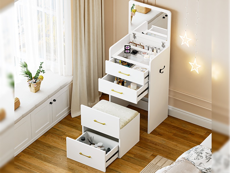 Le dressing, la table de chevet et le tabouret sont combinés en un seul meuble compact d’angle dressing-table de chevet. La coiffeuse est également équipée d’un miroir à rabattre : il s’ouvre pour devenir une simple coiffeuse et se ferme pour former une table de chevet avec un grand espace de rangement, un design plus économiseur d’espace parfait pour les petits logements.