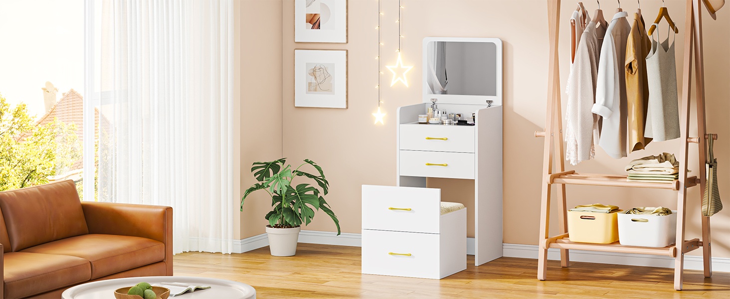 Notre tabouret assorti avec coussin est doux et confortable, idéal pour que les femmes profitent encore plus du processus de maquillage et de soins de la peau. Ce tabouret peut être placé complètement sous la table sans occuper d’espace supplémentaire, optimisant au maximum l’espace disponible.